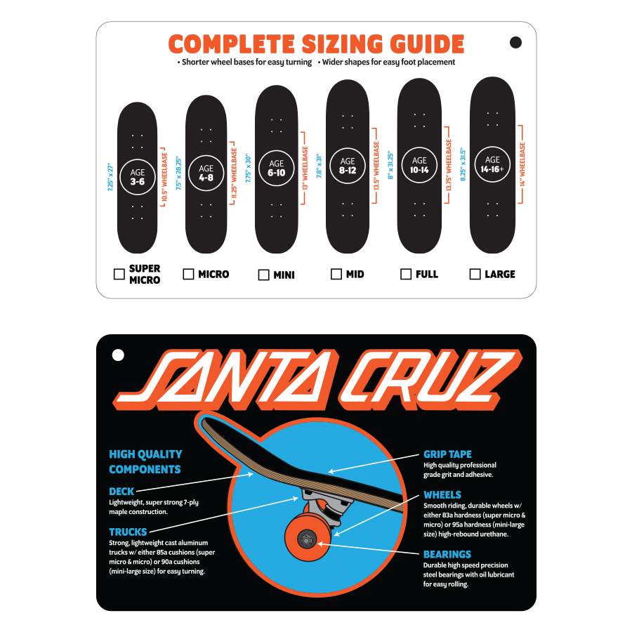 Wheels: Smooth riding, durable wheels w/ either 83a hardness (super-micro, micro, & mini) or 95a hardness (mid-large sizes) high-rebound urethane.
