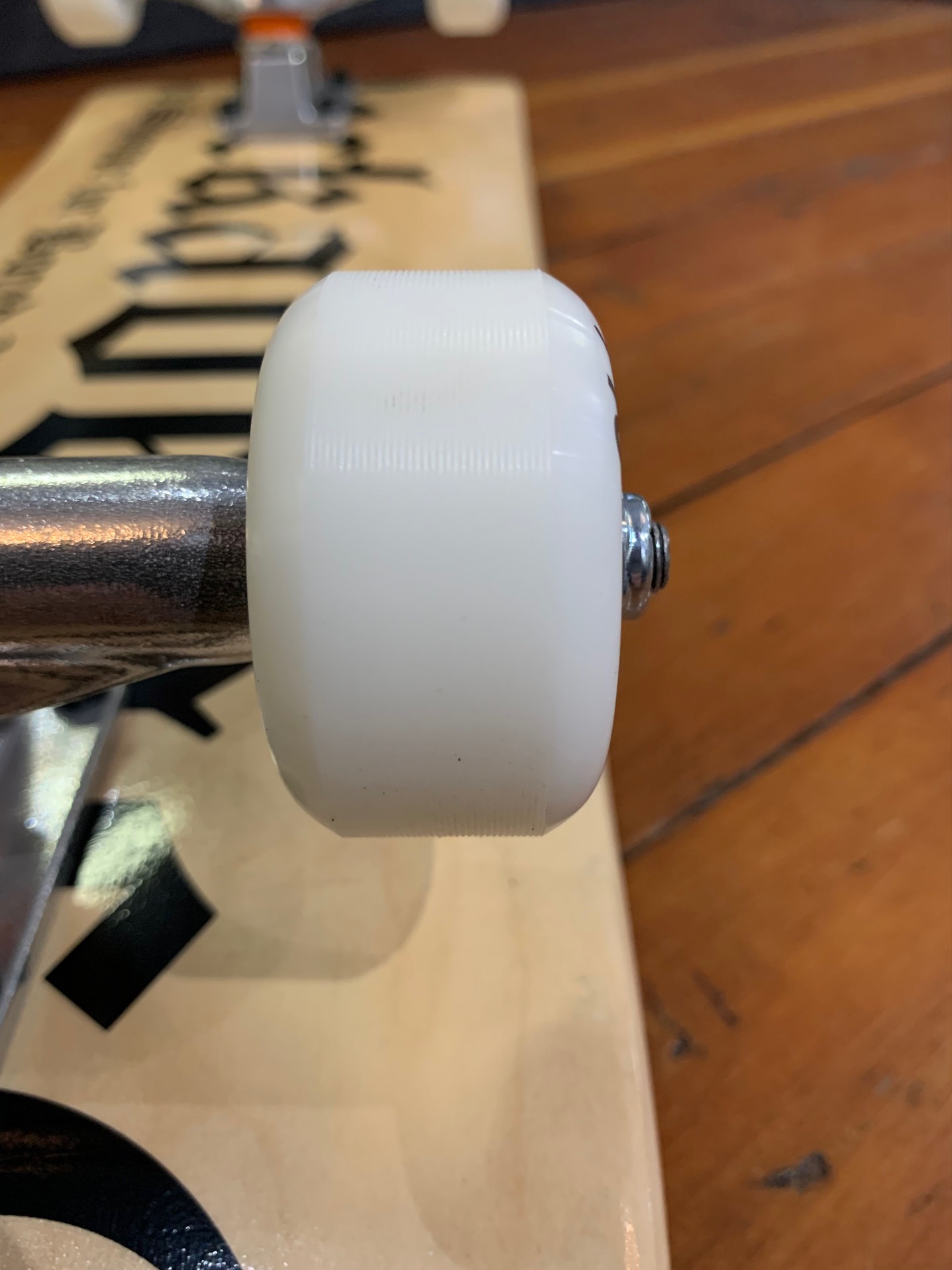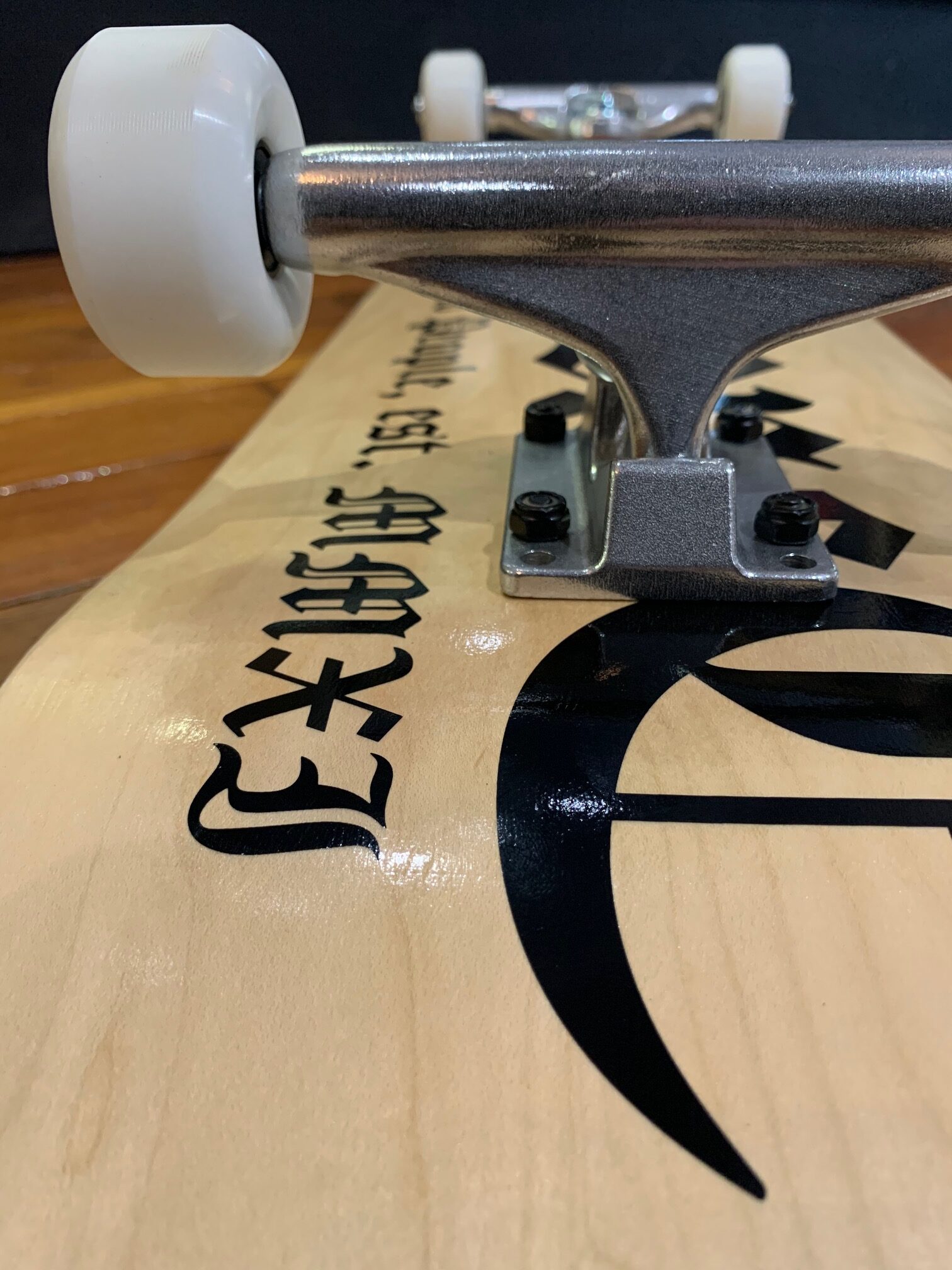 Our Deckadence Script Complete Skateboards are typically available in Natural (as pictured). However, by request, we can customize them with a variety of stain colors. Choose from two popular sizes: 8.0″ and 8.25″, each perfectly configured with matching trucks and wheels.